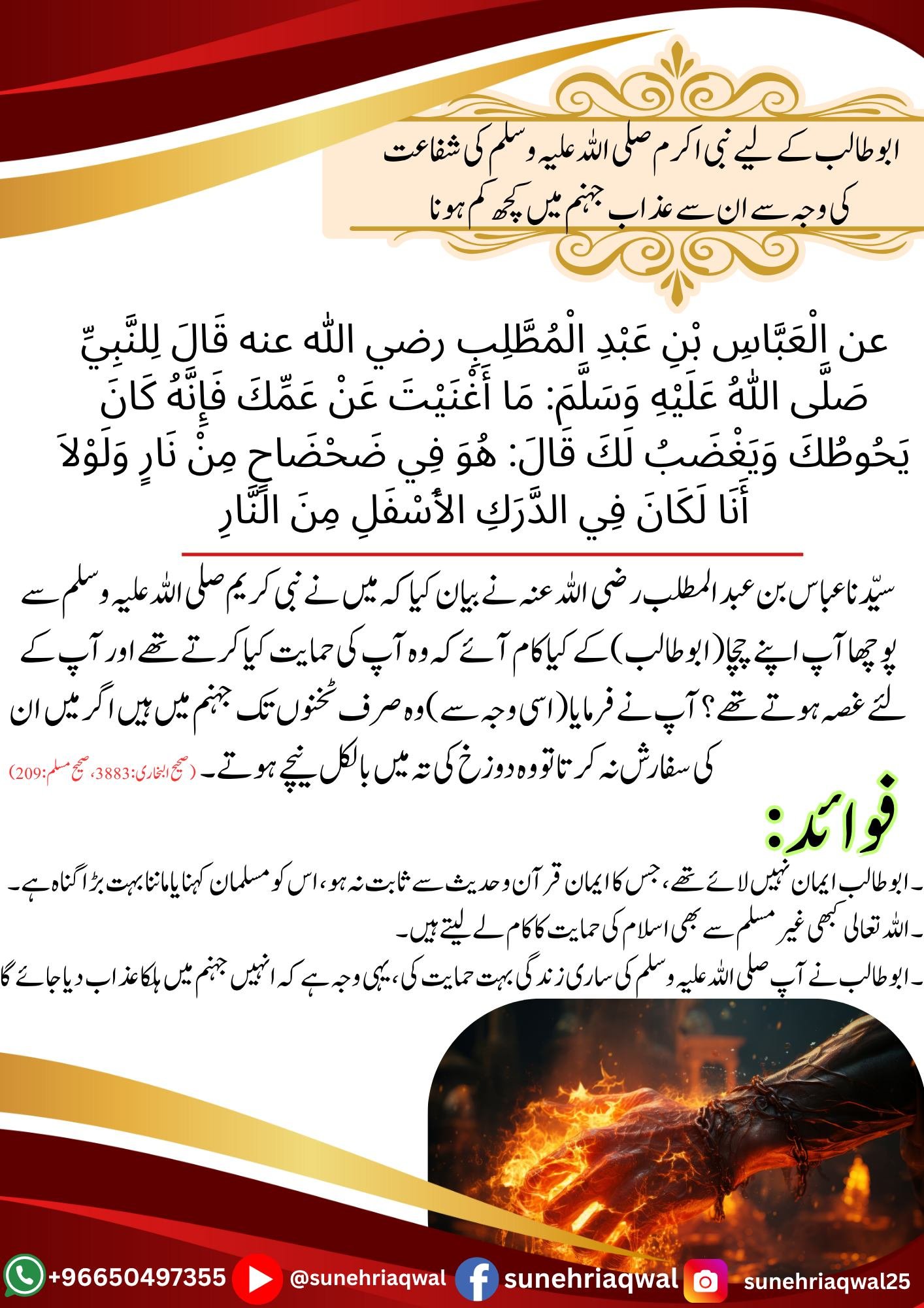 ابو طالب کے لیے نبی اکر ﷺ کی شفاعت کی وجہ سے ان سے عذاب جہنم میں کچھ کمی ہونا (صحیح بخاری 3883)