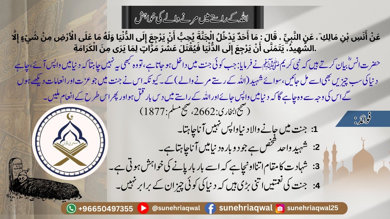 اللہ کے راستے میں مرنے والے کی خواہش( صحیح البخاری – 2662,صحیح مسلم – 1877)