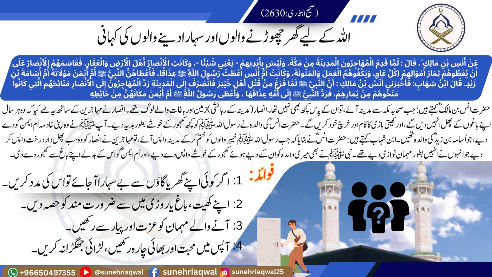اللہ کے لیے گھر چھوڑنے والوں اور سہارادینے والوں کی کہانی ( صحیح البخاری  – 2630 )