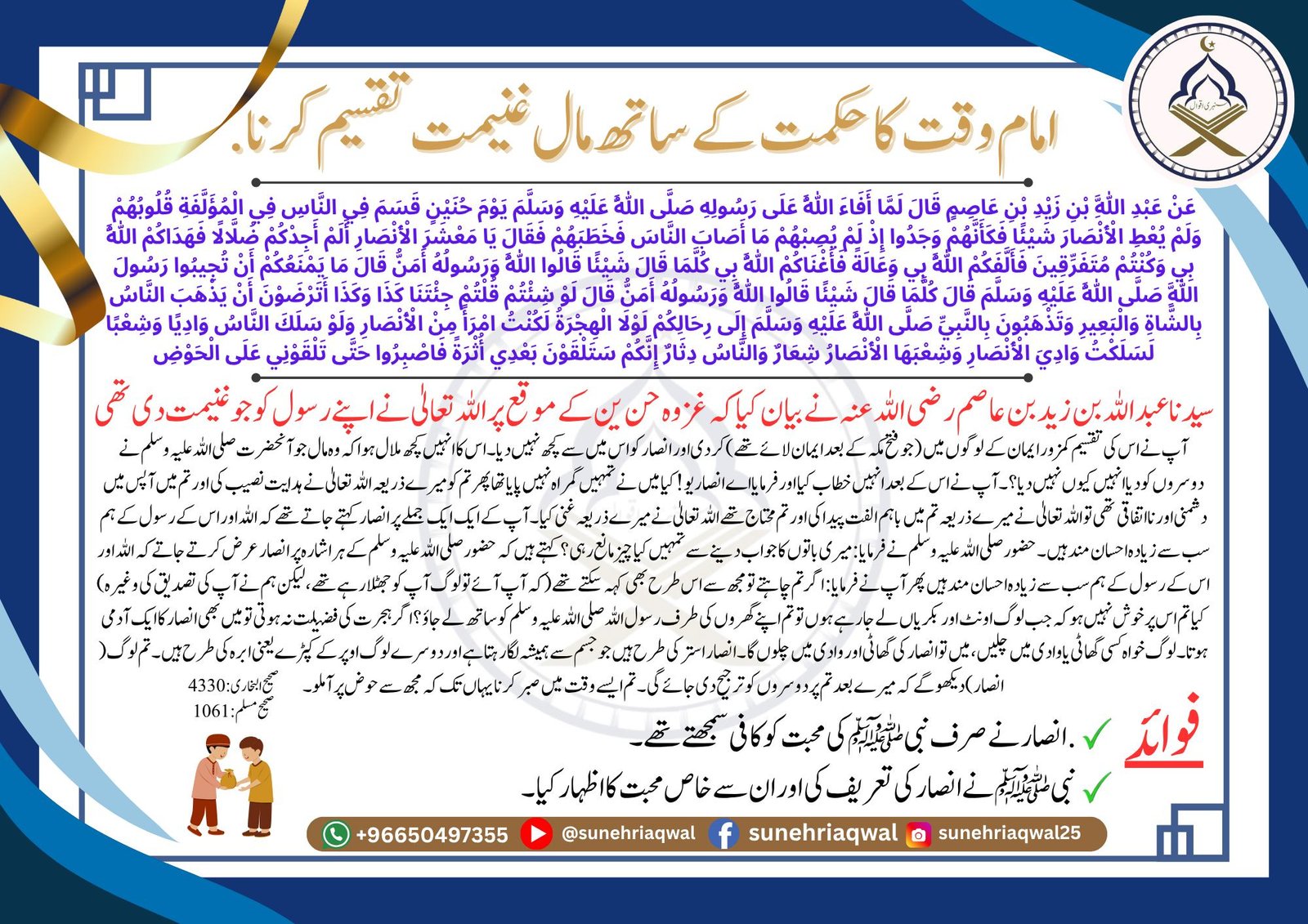 . امام وقت کا حکمت کے ساتھ مال غنیمت تقسیم کرنا ( صحیح البخاری – 4337 صحیح مسلم -1061 )