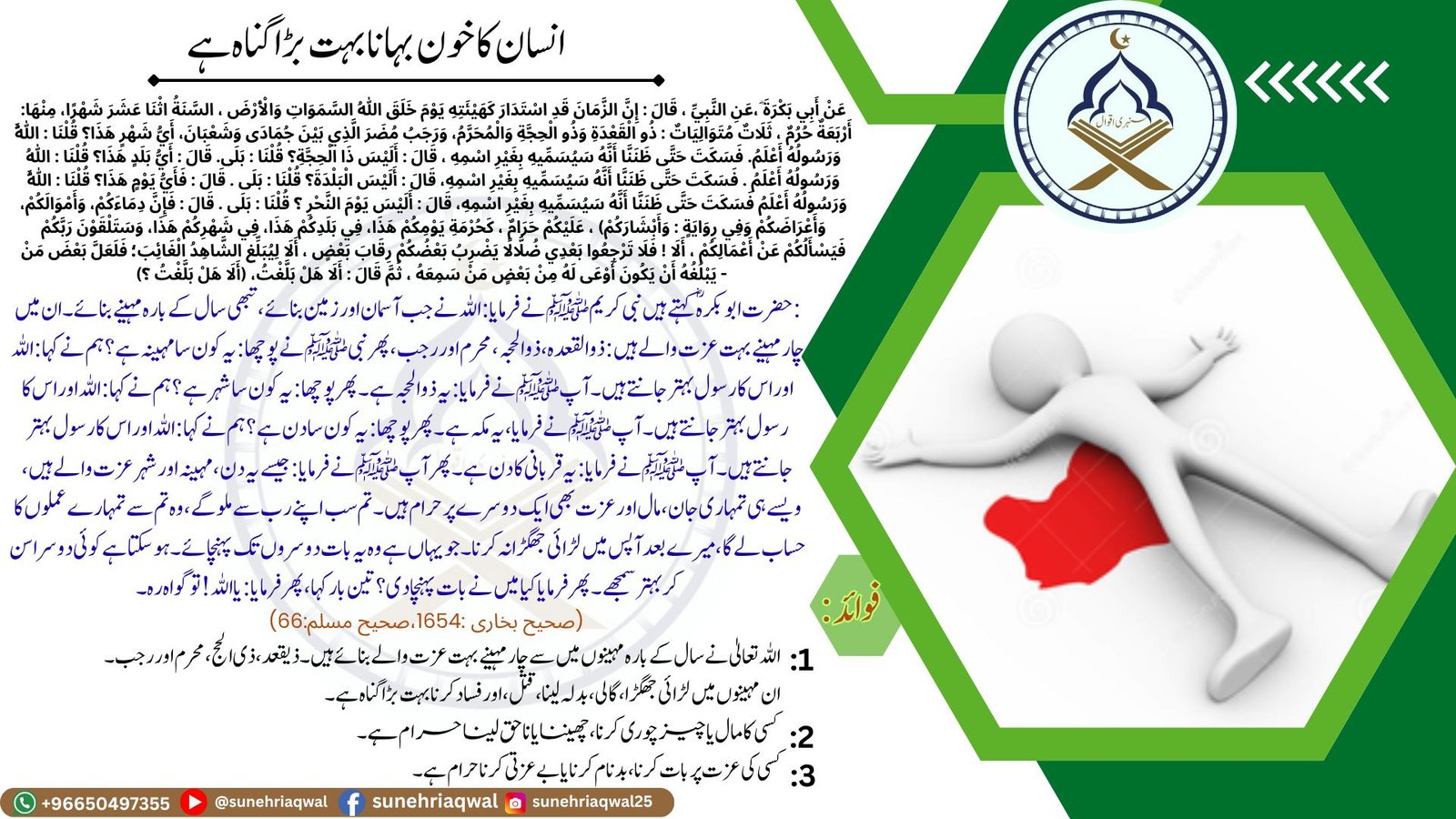 انسان کا خون بہانا بہت بڑا گناہ ہے ( صحیح البخاری  – 1654 صحیح مسلم – 66)