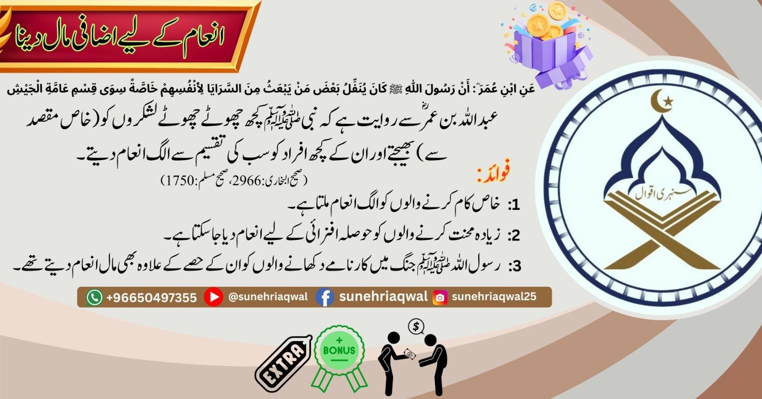 انعام کے لیے اضافی مال دینا ( صحیح البخاری – 2966 صحیح مسلم – 1750 )