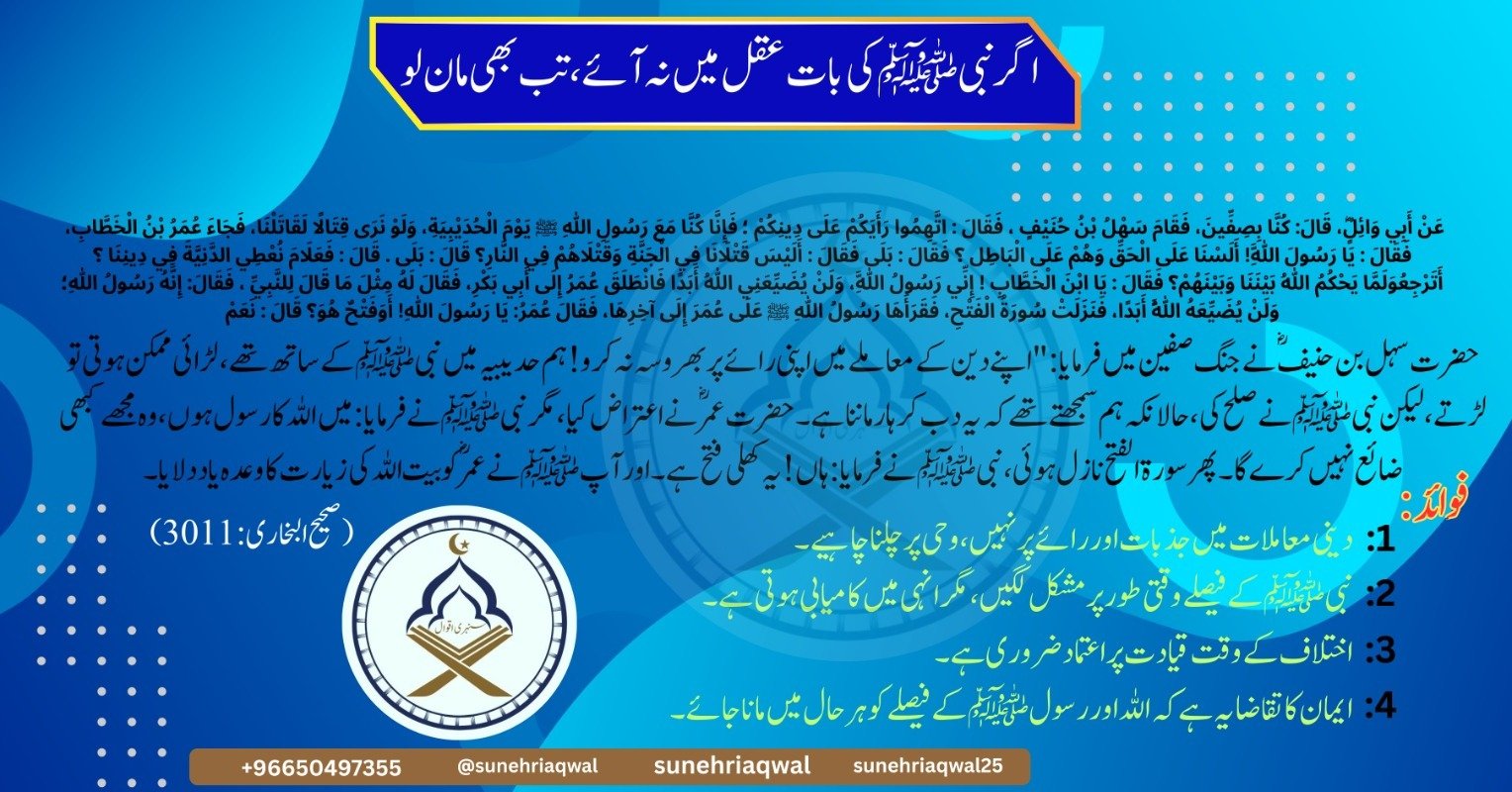 اگر نبی ﷺ کی بات عقل میں نہ آئے تب بھی مان لو ( صحیح البخاری – 3011 )