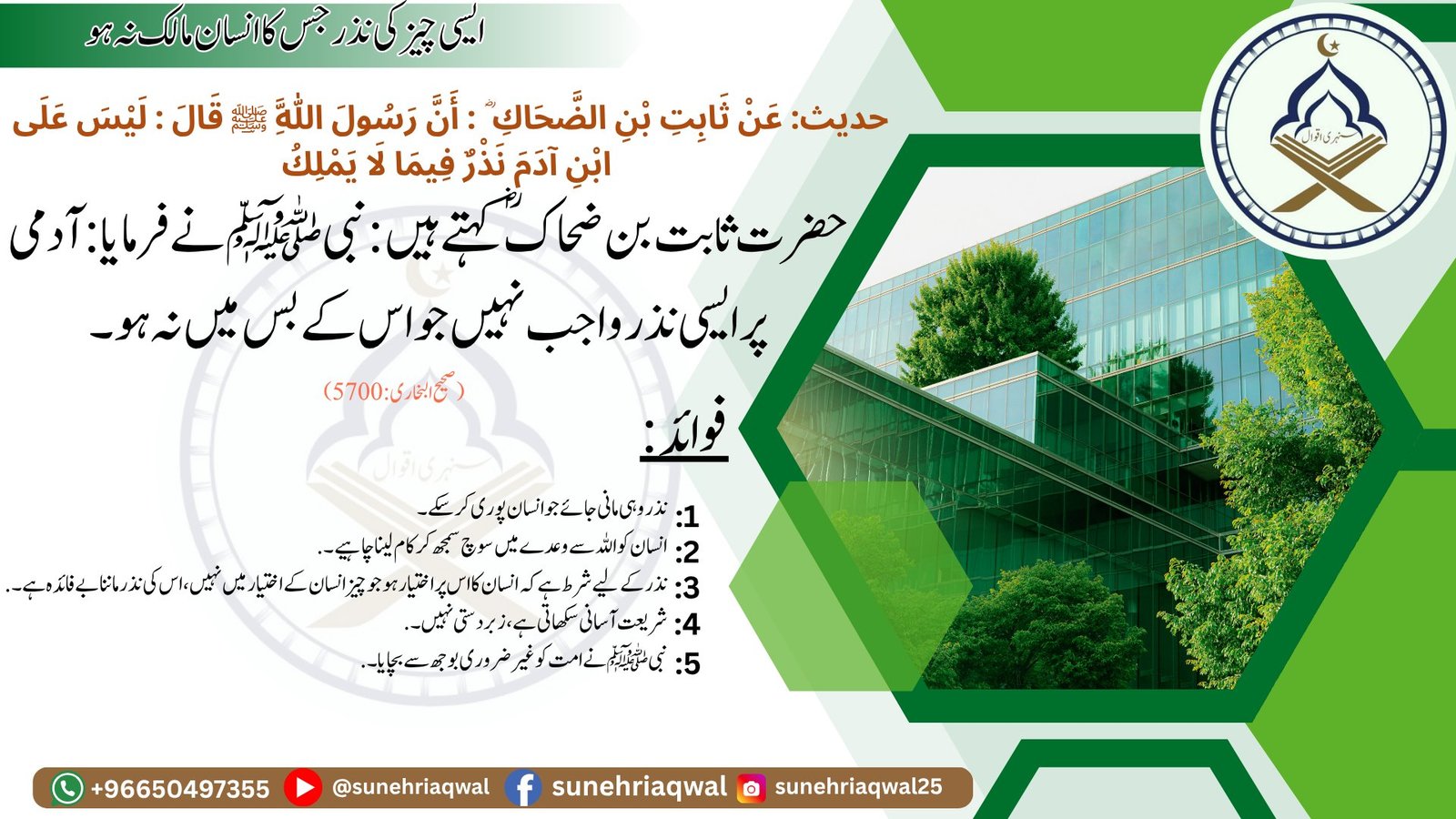 ایسی چیز کی نذر جس کا انسان مالک نہ ہو ( صحیح البخاری -5700 )