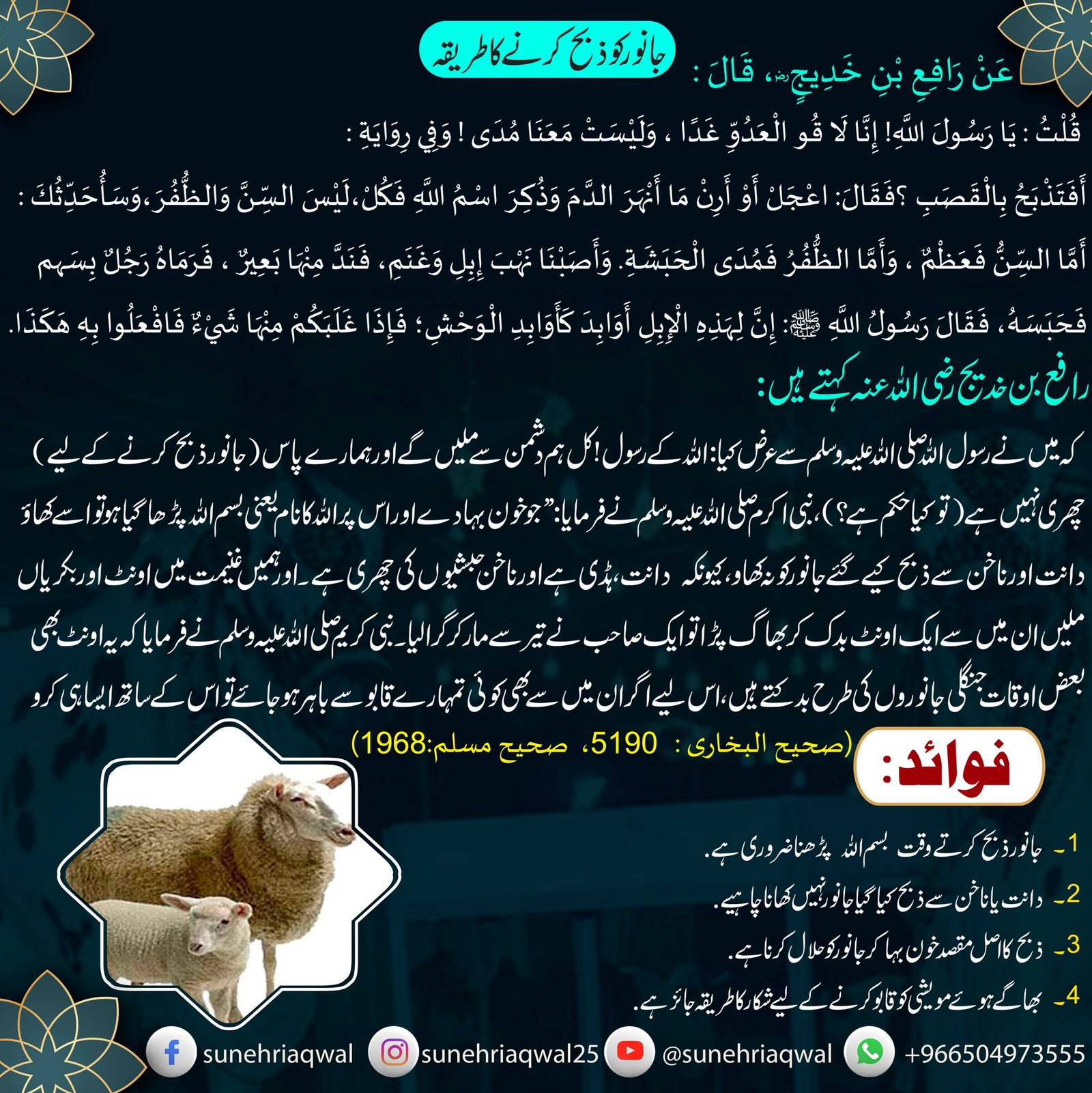 جانور کو ذبح کرنےکا طریقہ ( صحیح البخاری – 5190 صحیح مسلم – 1968 )