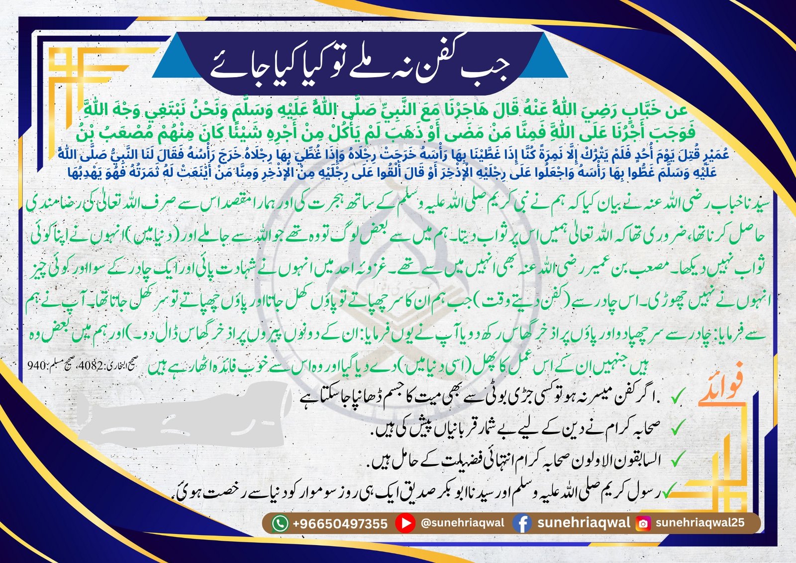 جب کفن نہ ملے تو کیا کیا جائے۔ ( صحیح البخاری -4082 صحیح مسلم -940 )