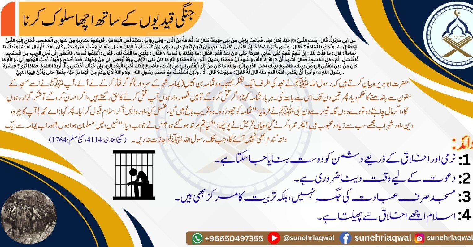 جنگی قیدیوں کے ساتھ اچھا سلوک کرنا ( صحیح البخاری – 4114 صحیح مسلم – 1764 )
