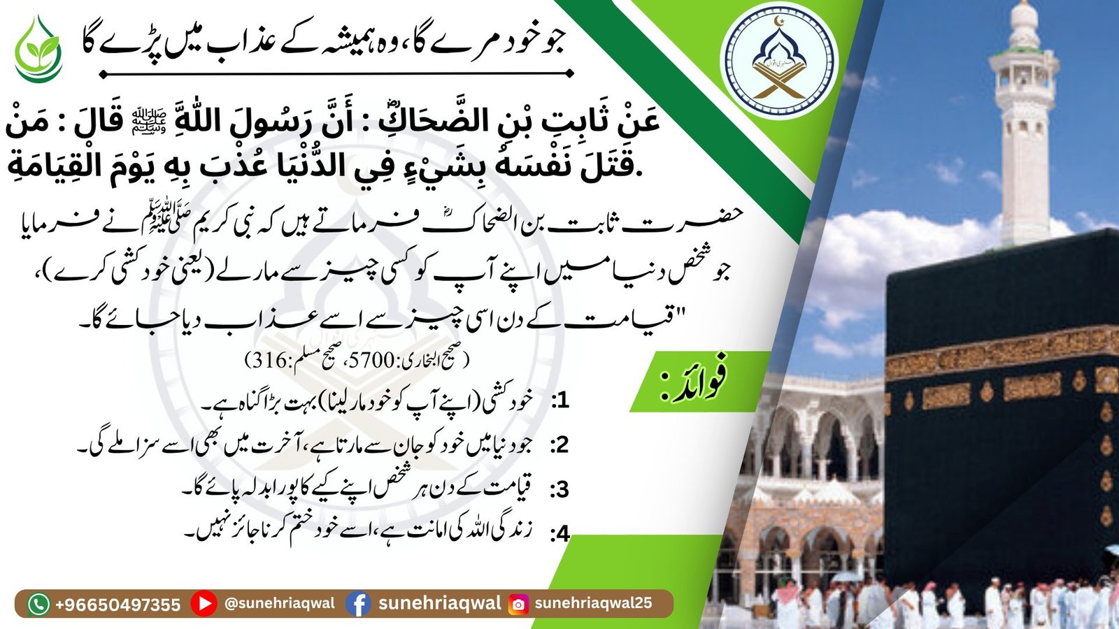 جو خود مرے گا، وہ ہمیشہ کے عذاب میں پڑے گا ( صحیح البخاری – 5700 صحیح مسلم – 316)