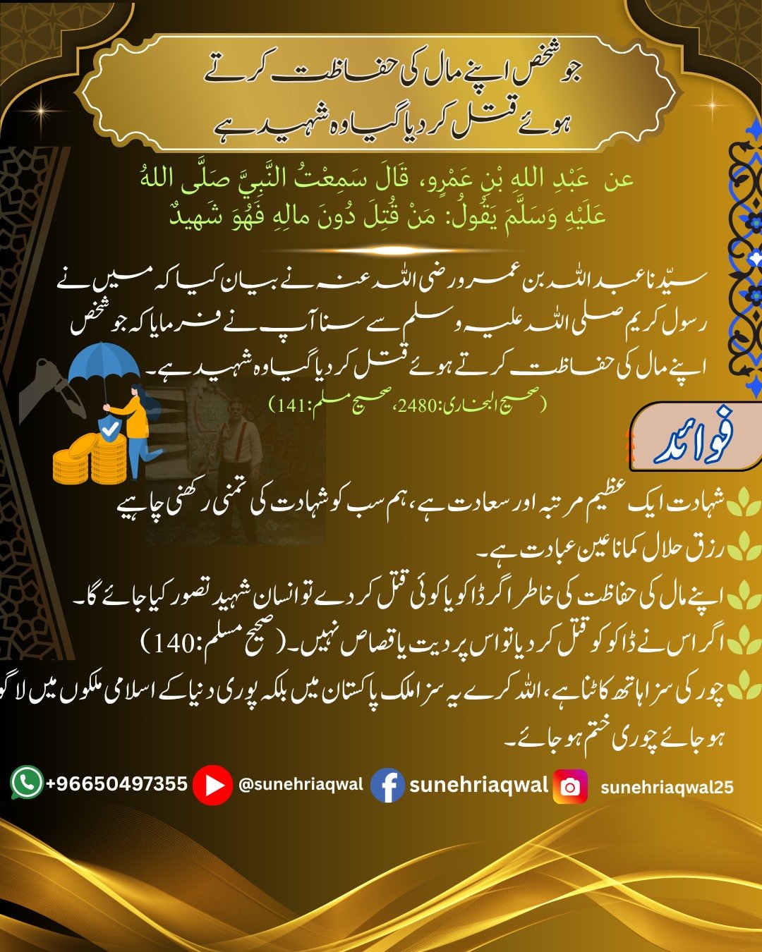 جو شخص اپنے مال کی حفاظت کرتے ہوئے قتل کر دیا گیا وہ شہید ہے ( صحیح البخاری -2480 صحیح مسلم -141 )