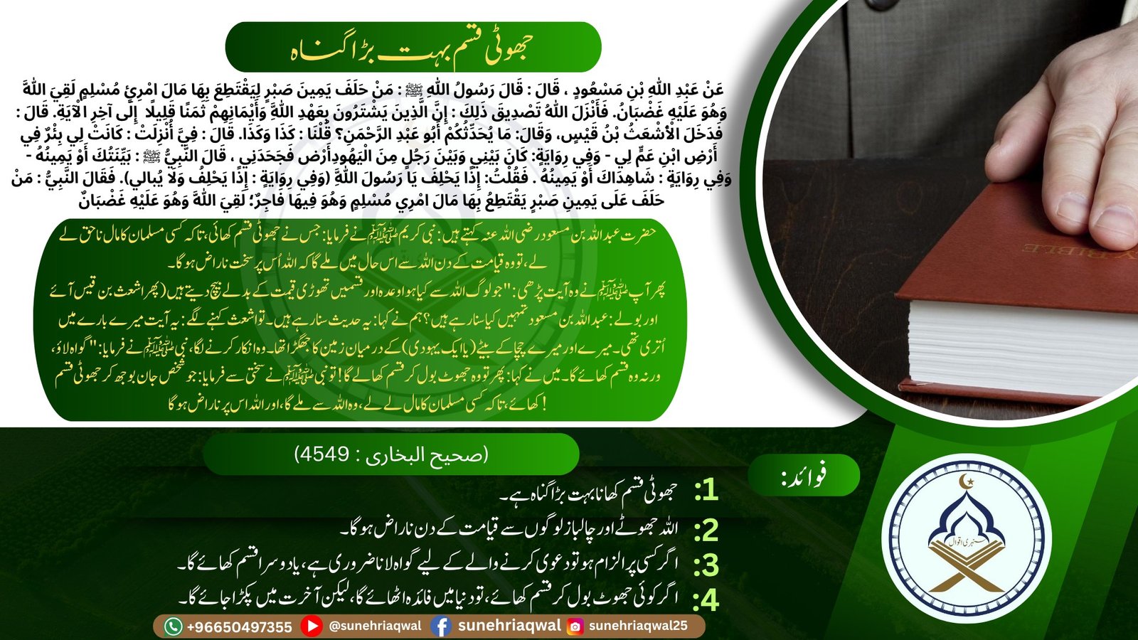 جھوٹی قسم بہت بڑا گناہ ( صحیح البخاری – 2964 صحیح مسلم – 1649)