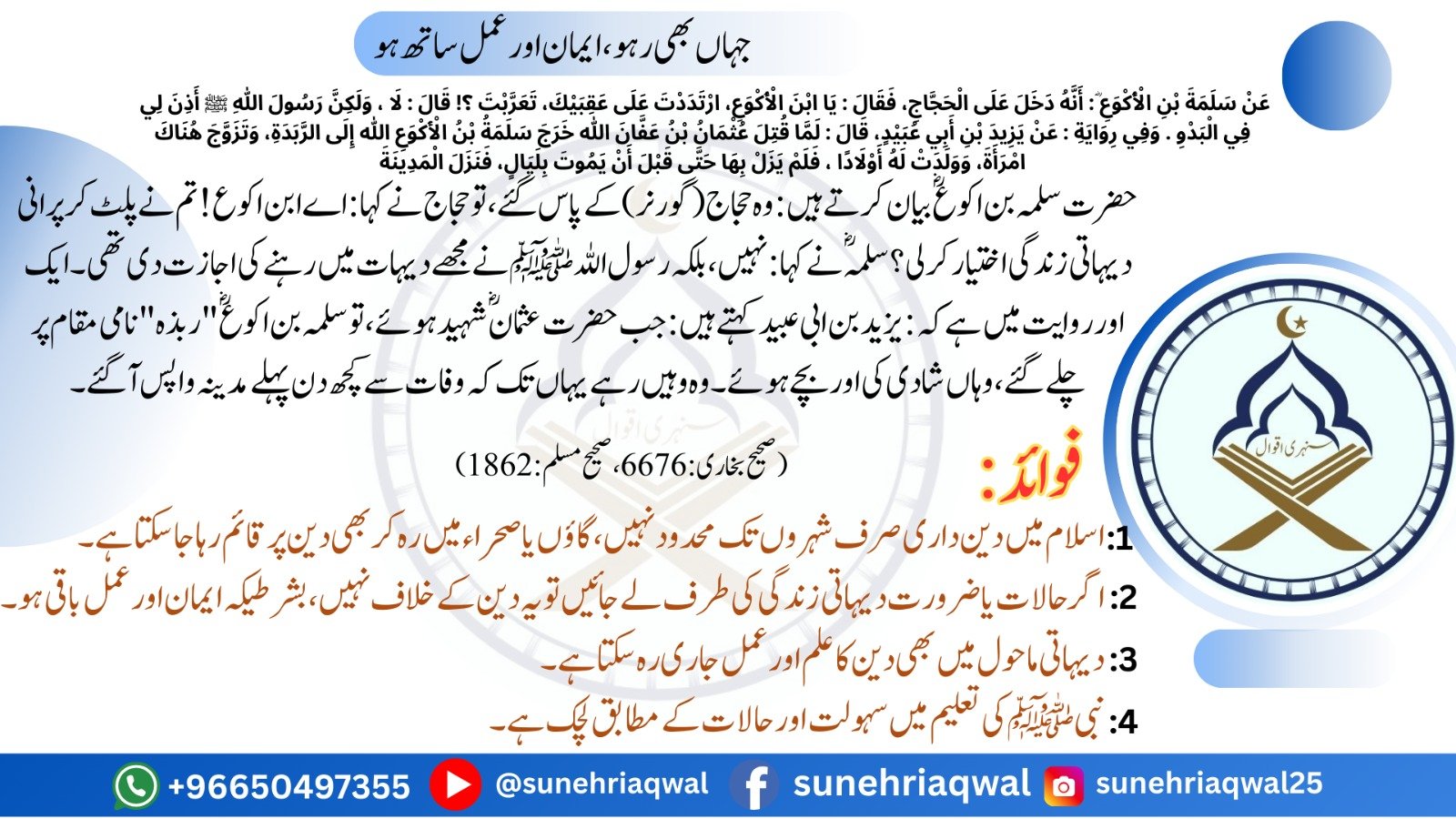 جہاں بھی رہو، ایمان اور عمل ساتھ رہو ( صحیح البخاری  – 6676 صحیح مسلم – 1862 )