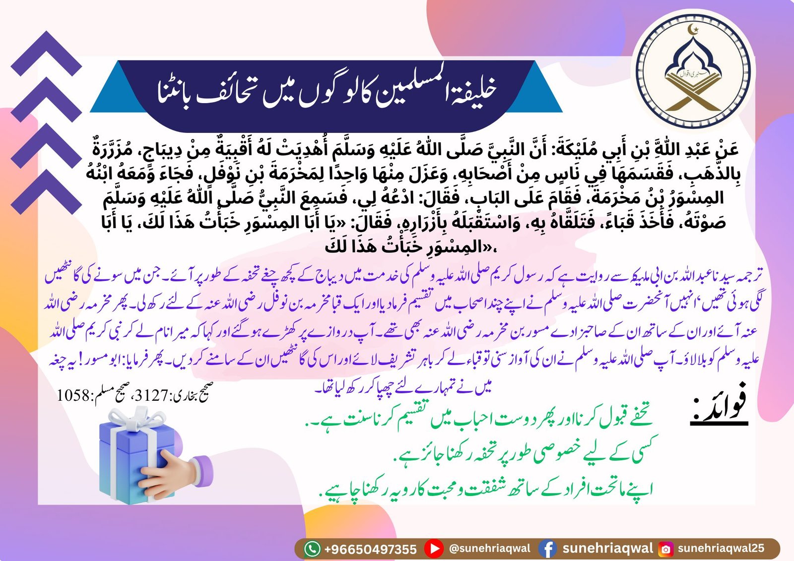 خلیفۃ المسلمین کا لوگوں میں تحائف بانٹنا (صحیح بخاری 3127 صحیح مسلم 1058)