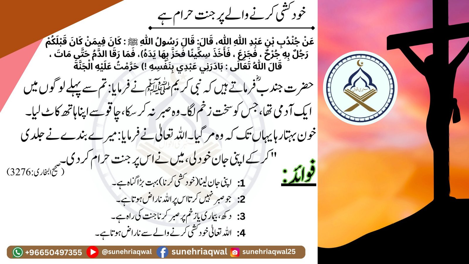 خود کشی کرنے والے پر جنت حرام ہے ( صحیح البخاری – 3276 )
