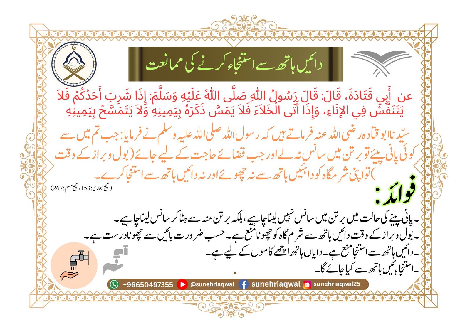 دائیں ہاتھ سے استنجاء کرنے کی ممانعت ( صحیح البخاری -153 صحیح مسلم -267 )