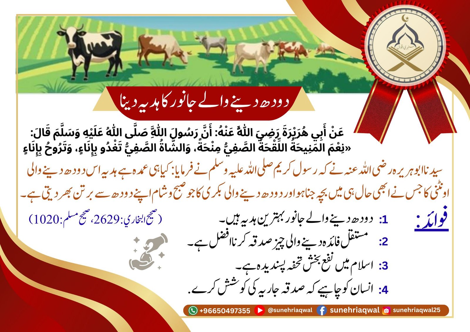 دودھ دینے والے جانور کا ہدیہ دینا ( صحیح البخاری – 2629 صحیح مسلم – 1020 )