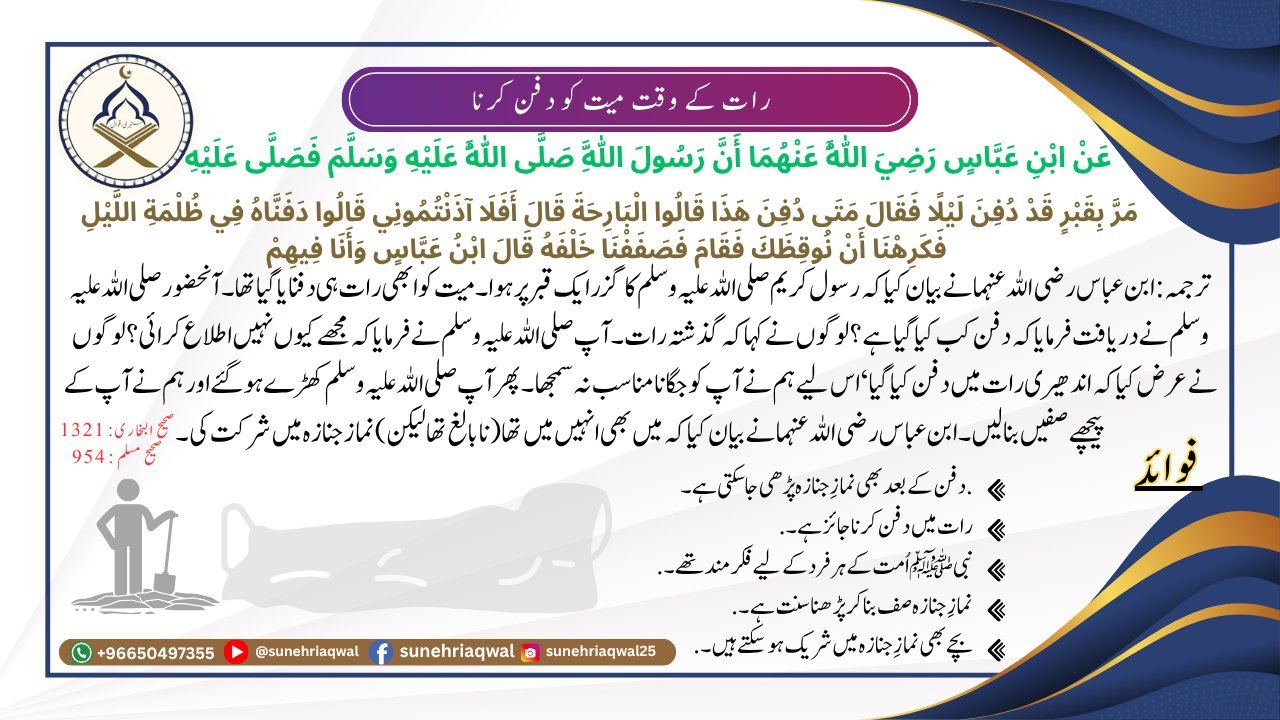 رات کے وقت میت کو دفن کرنا (صحیح بخاری 1321 صحیح مسلم 954)