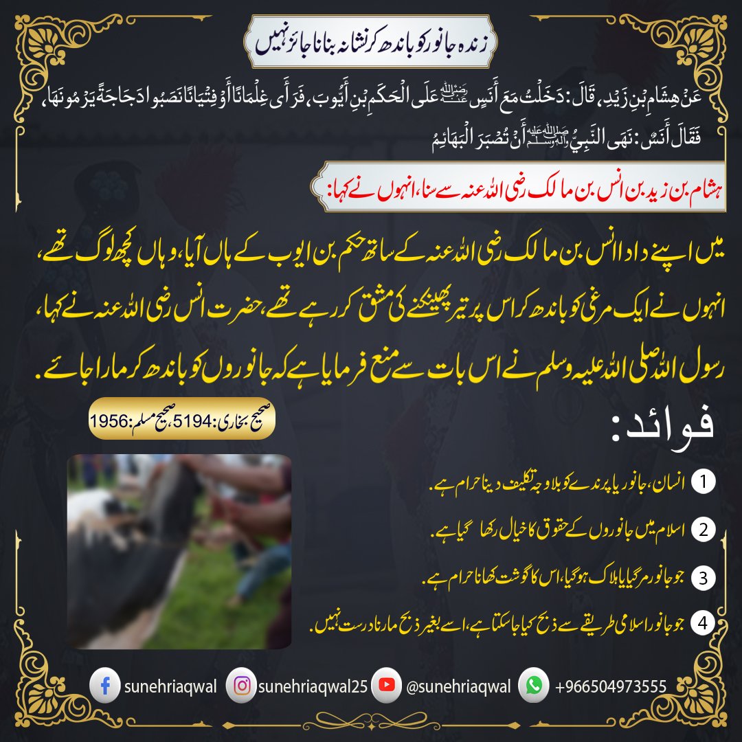 زندہ جانور کو باندھ کر نشانہ بنانا جائز نہیں( صحیح البخاری – 5194 صحیح مسلم – 1956 )