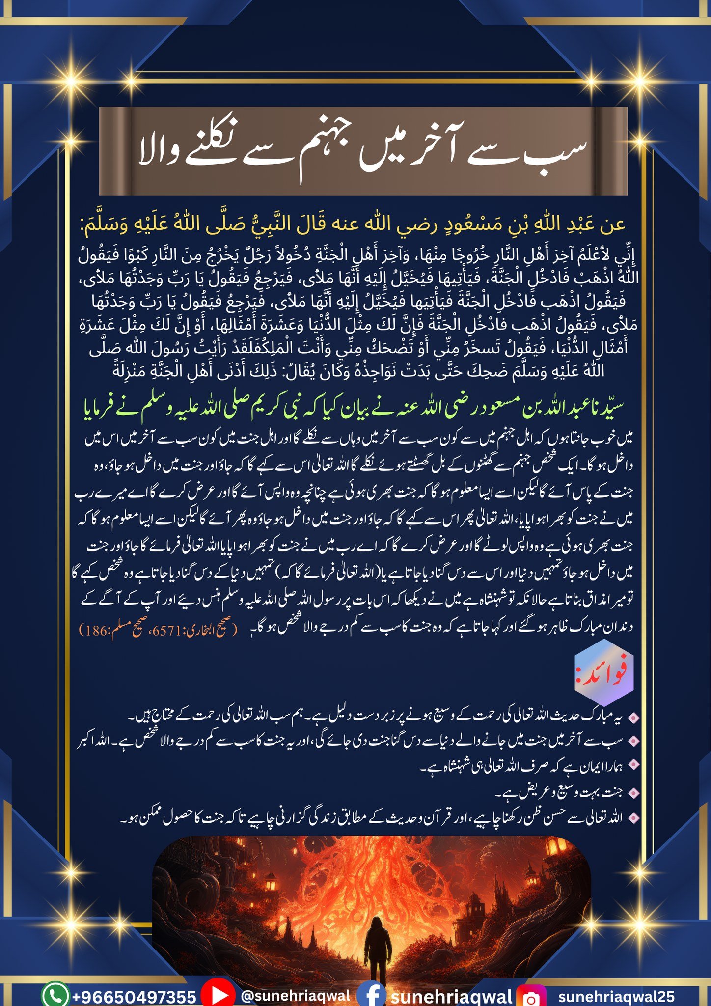 سب سے آخر میں جہنم سے نکلنے والا ( صحیح البخاری 6571 صحیح مسلم – 186)