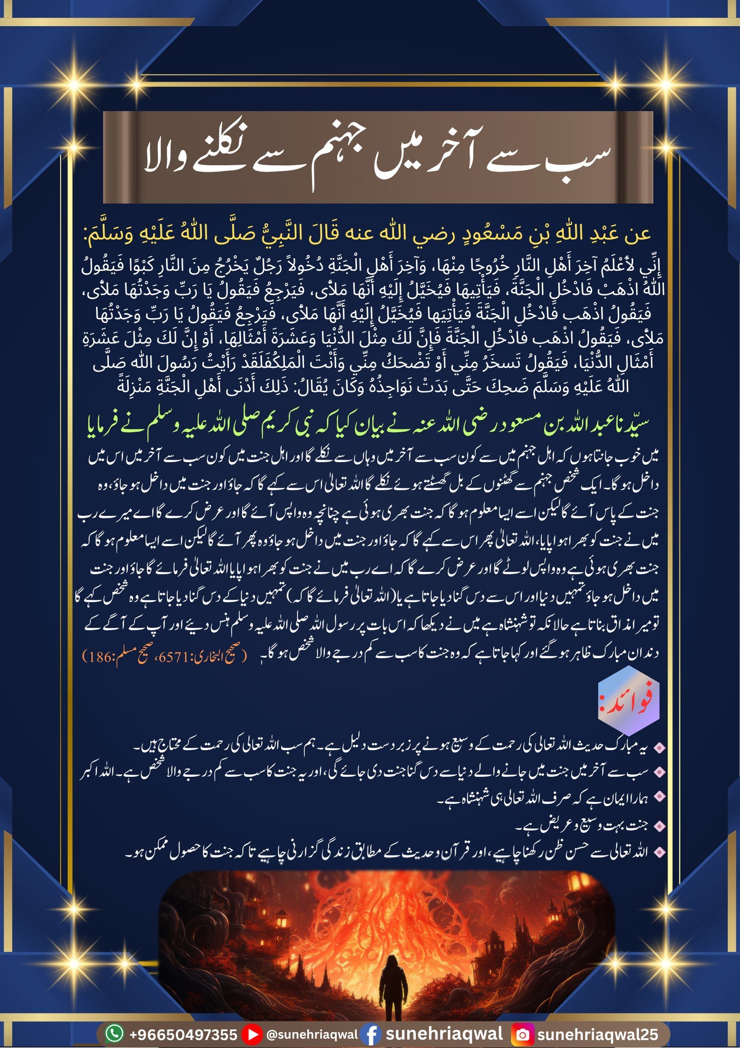 سب سے آخر میں جہنم سے نکلنے والا ( صحیح البخاری  -6571 صحیح مسلم -186 )
