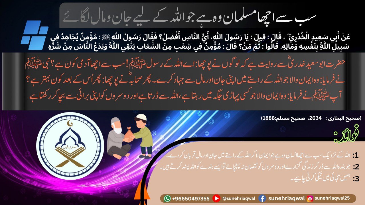 سب سے اچھا مسلمان وہ ہے جو اللہ کے لیے جان و مال لگائے( صحیح البخاری – 2634,صحیح مسلم – 1888)