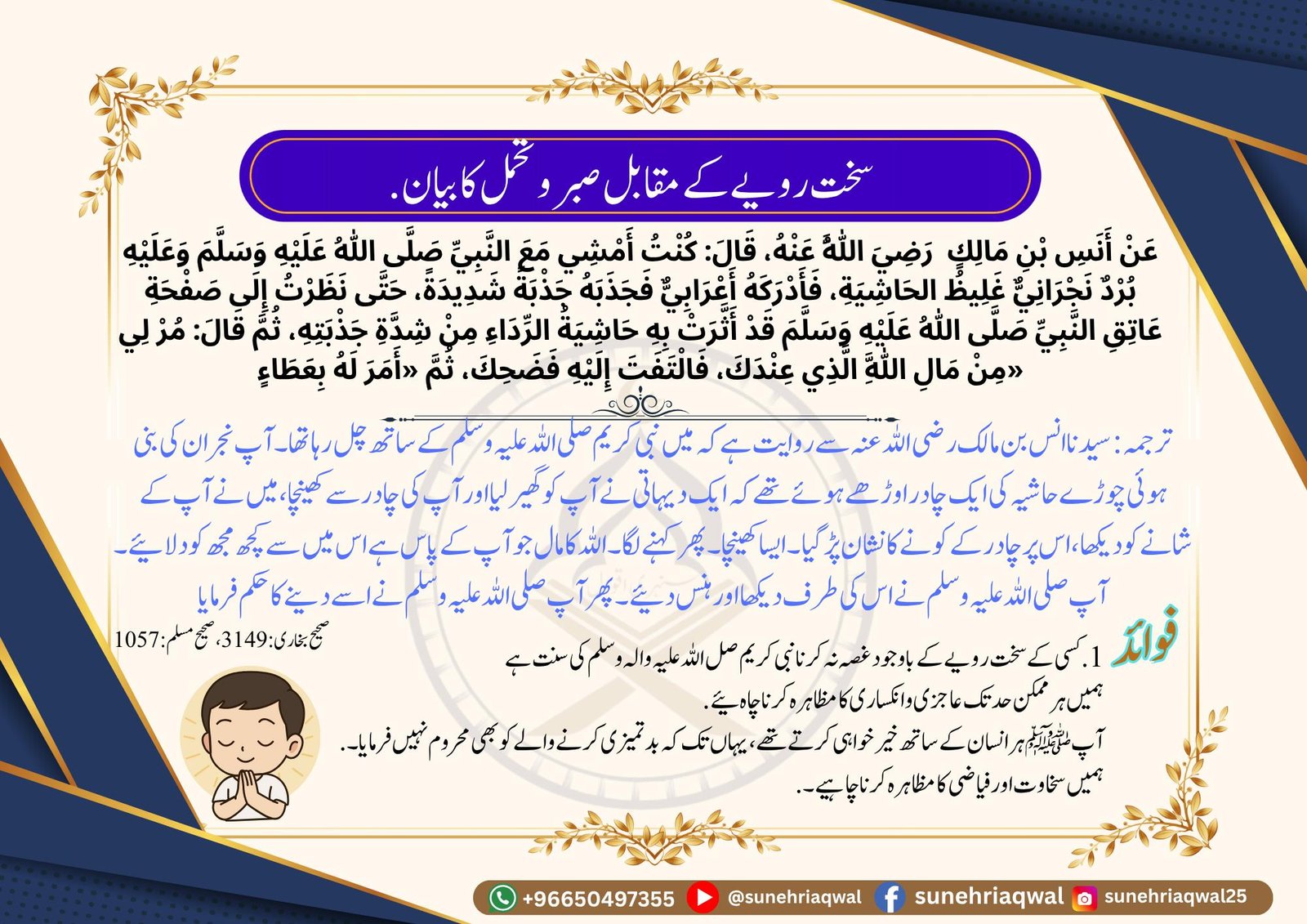 سخت رویے کے مقابل صبر و تحمل کا بیان (صحیح بخاری 3149 صحیح مسلم 1057)
