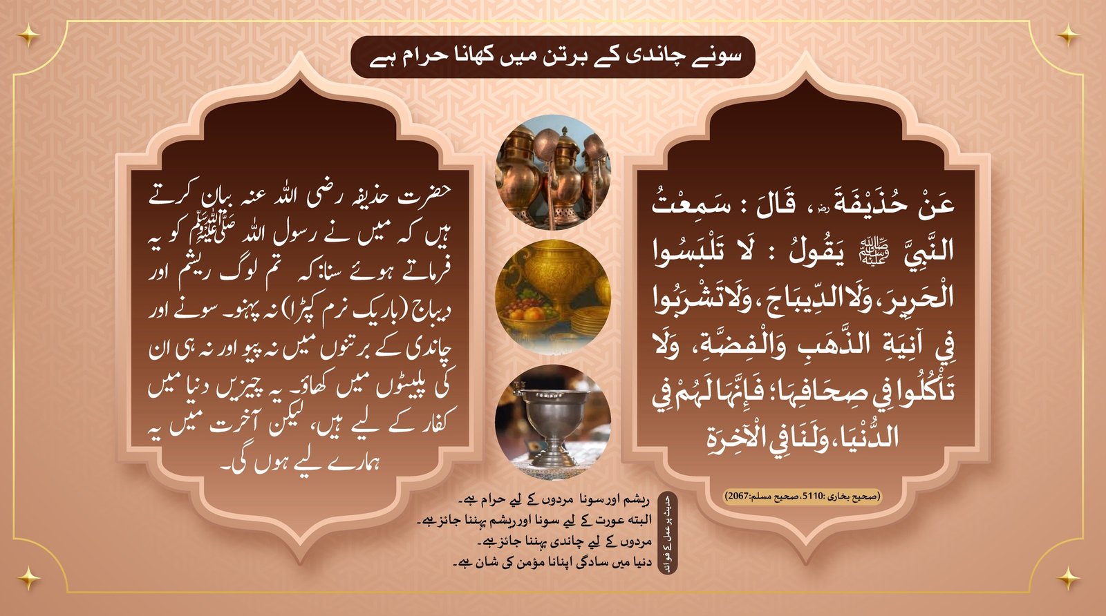سونے چاندی کے برتن میں کھانا حرام ہے ( صحیح البخاری  – 5110 صحیح مسلم – 2067 )
