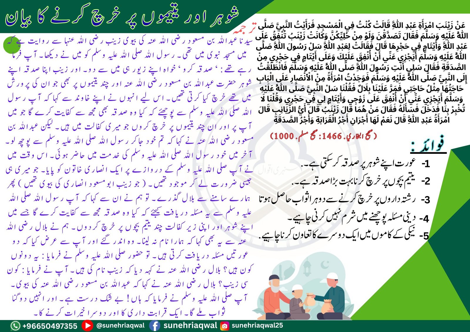 شوہر اور تمیوں پر خرچ کرنے کا بیان ( صحیح البخاری  – 1461 صحیح مسلم – 1000 )