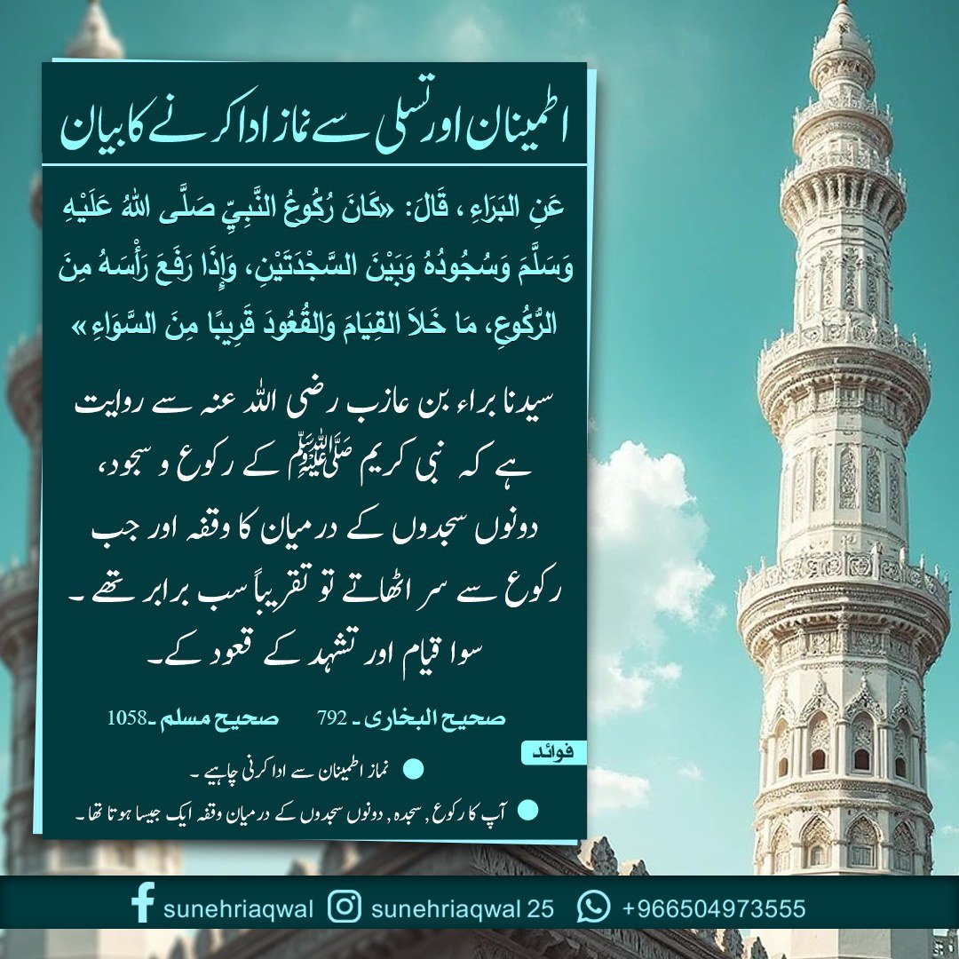 اطمینان اور تسلی سے نماز ادا کرنے کا بیان ( صحیح مسلم – 1058 صحیح البخاری – 792 )