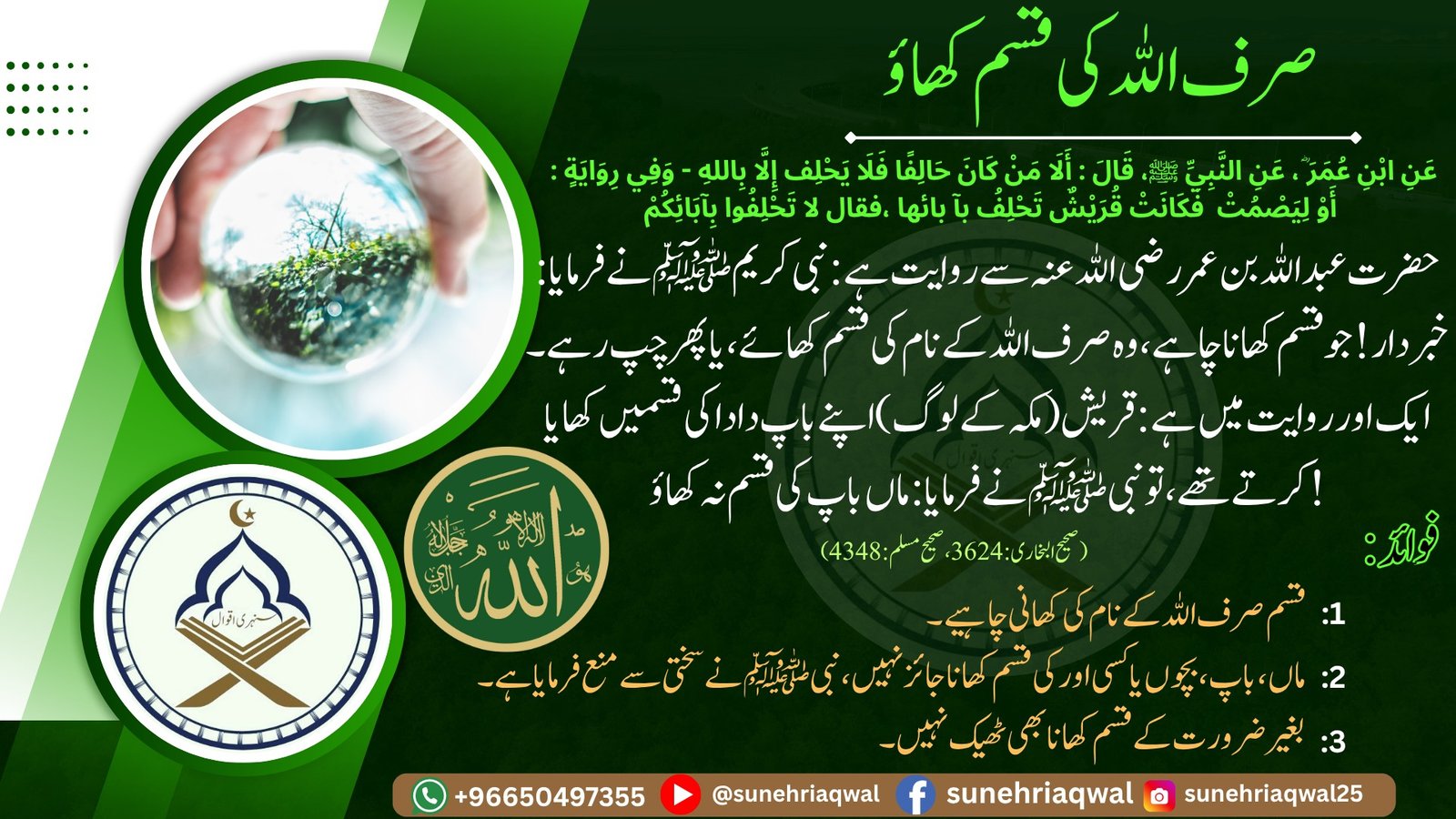 صرف اللہ کی قسم کھاؤ ( صحیح البخاری -3624 صحیح مسلم – 4348)