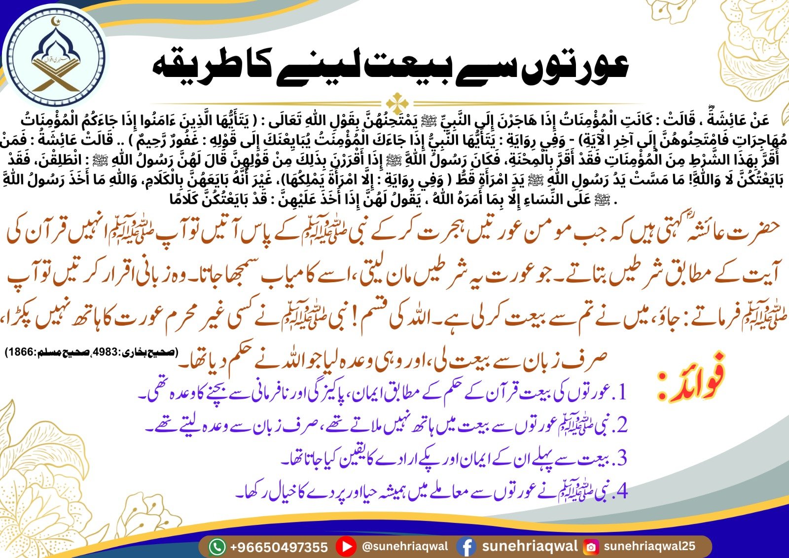 عورتوں سے بیعت لینے کا طریقہ ( صحیح البخاری – 4983 صحیح مسلم – 1866 )