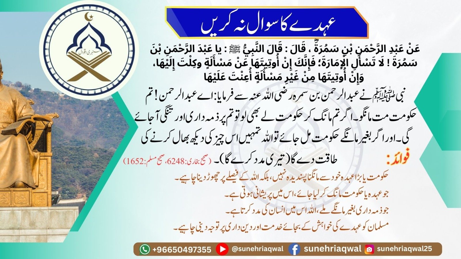 عہدے کا سوال نہ کریں ( صحیح البخاری – 6248 صحیح مسلم – 1652 )