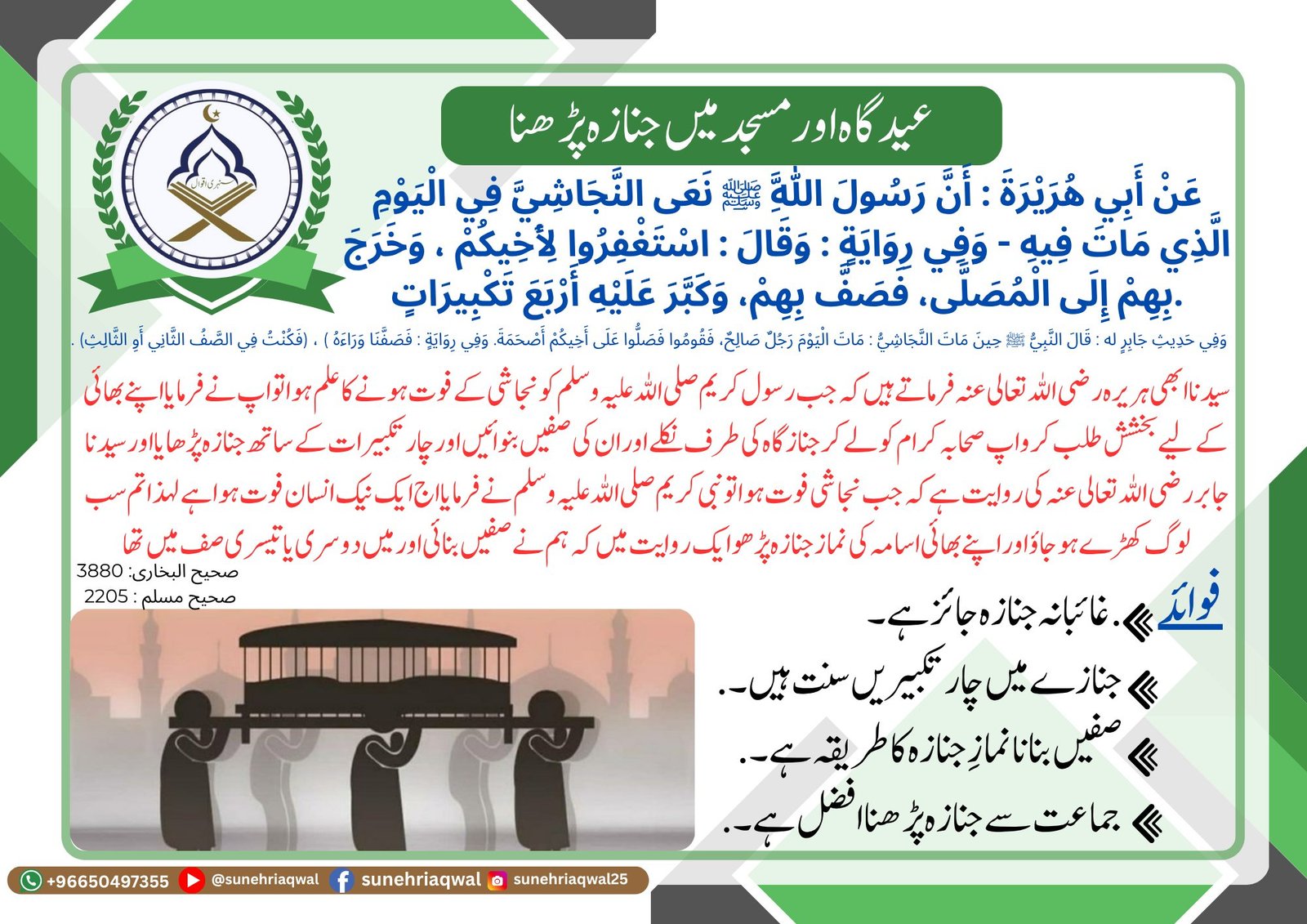 عید گاہ اور مسجد میں جنازہ پڑھنا ( صحیح البخاری  – 3880 صحیح مسلم – 2205 )