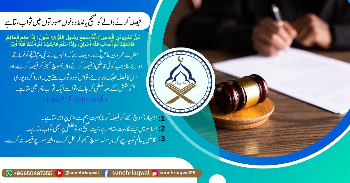 فیصلہ کرنے والے کو صحیح یا غلط دونوں صورتوں میں ثواب ملتا ہے ( صحیح البخاری – 6919 صحیح مسلم – 1716 )
