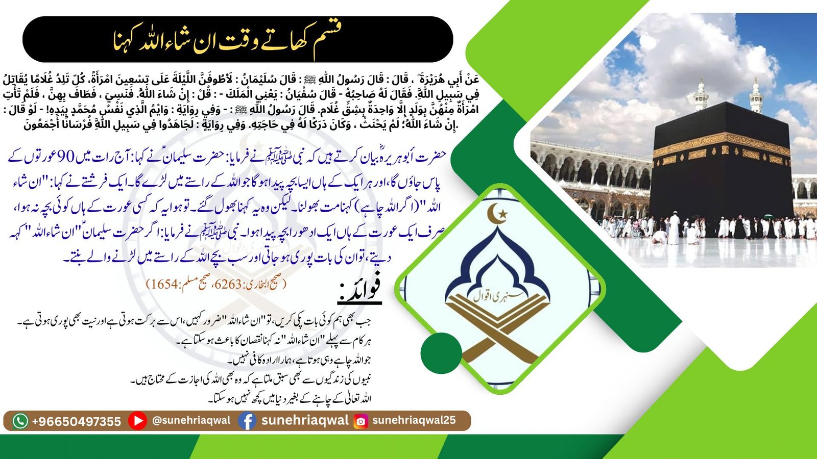 قسم کھاتے وقت ان شاء اللہ کہنا( صحیح البخاری – 6263 صحیح مسلم – 1654)