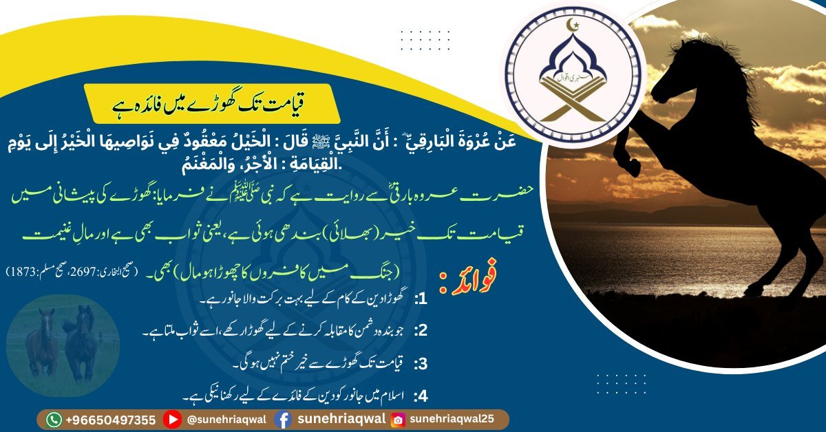 قیامت تک گھوڑے میں فائدہ ہے( صحیح البخاری – 2697,صحیح مسلم – 1873)