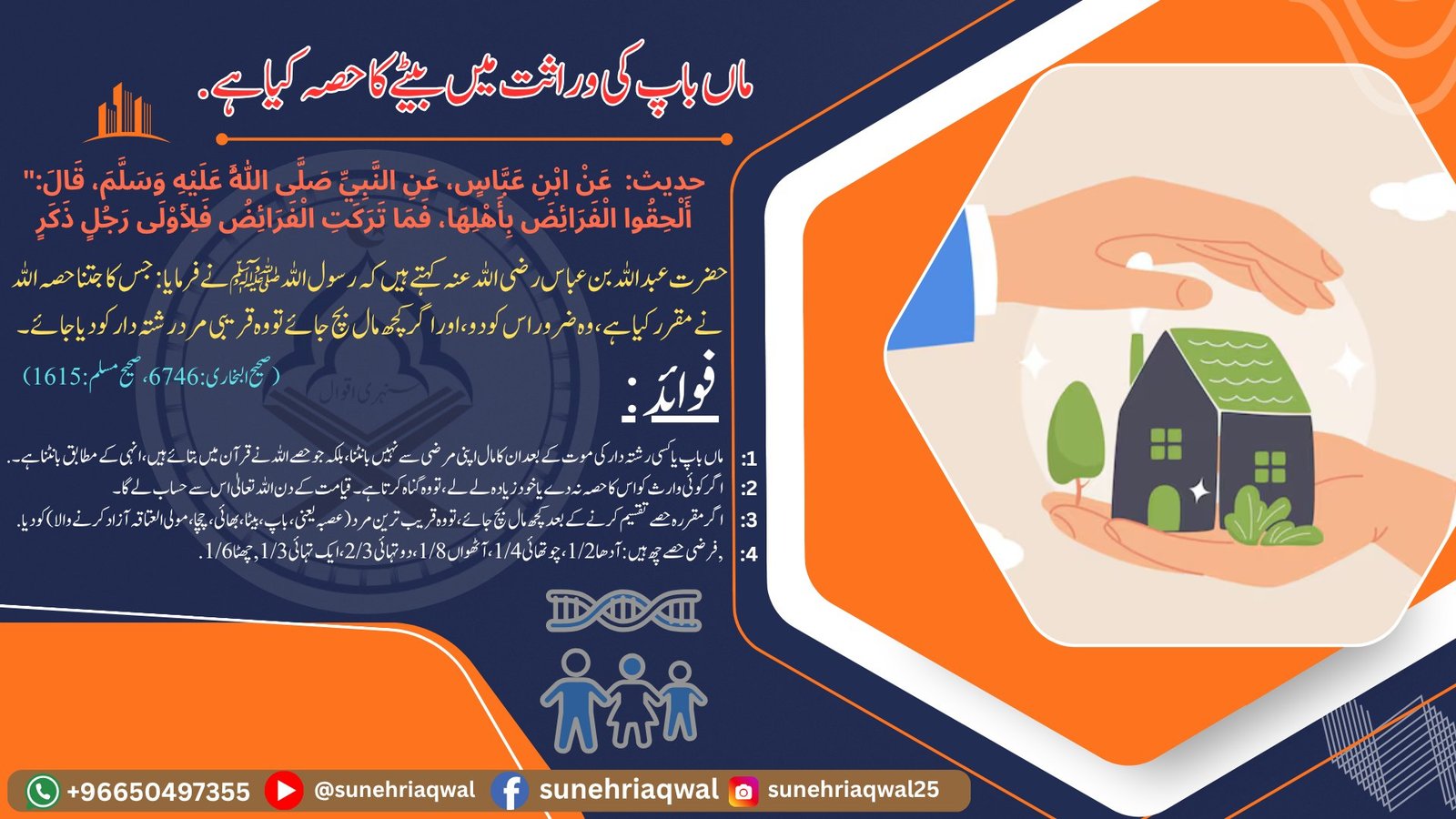 ماں باپ کی وراثت میں بیٹے کا حصہ کیا ہے۔( صحیح البخاری 6746 صحیح مسلم – 1615)
