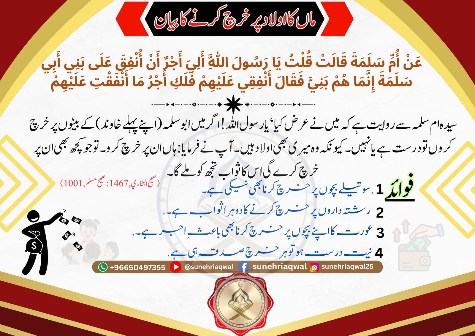 ماں کا اولاد پر خرچ کرنے کا بیان ( صحیح البخاری – 1467 صحیح مسلم – 1001 )
