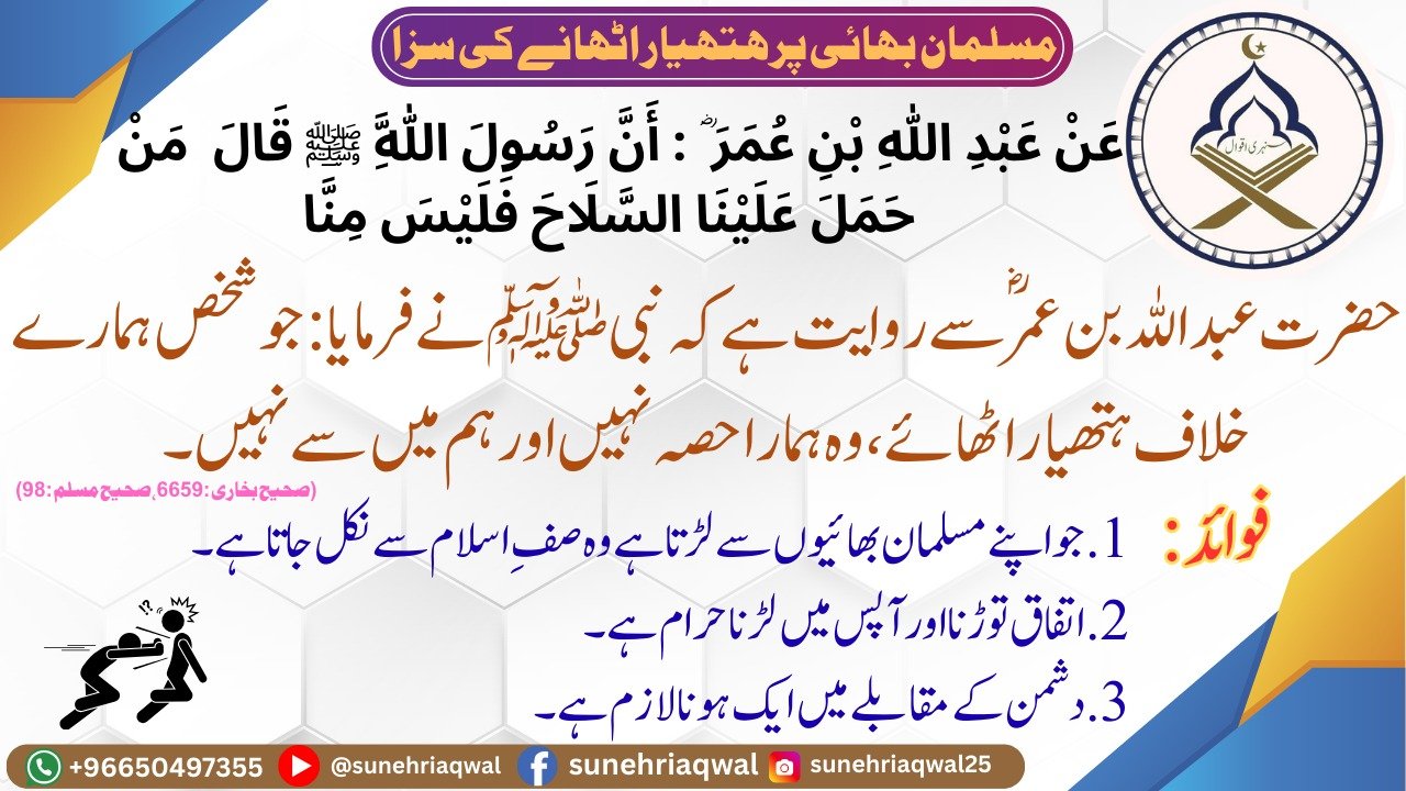 مسلمان بھائی پر ہتھیار اٹھانے کی سزا ( صحیح البخاری – 6659 صحیح مسلم – 98 )