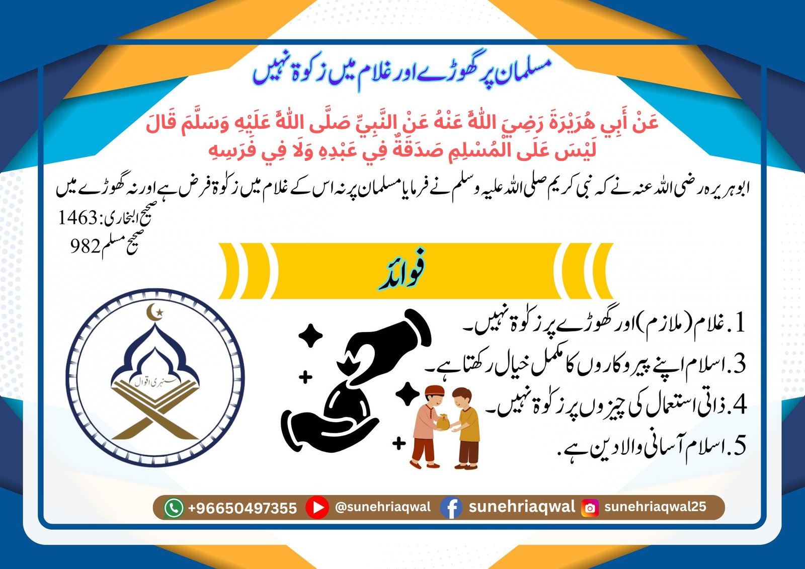 مسلمان پر گھوڑے اور غلام میں زکوۃ نہیں (صحیح بخاری 1463 صحیح مسلم 982)