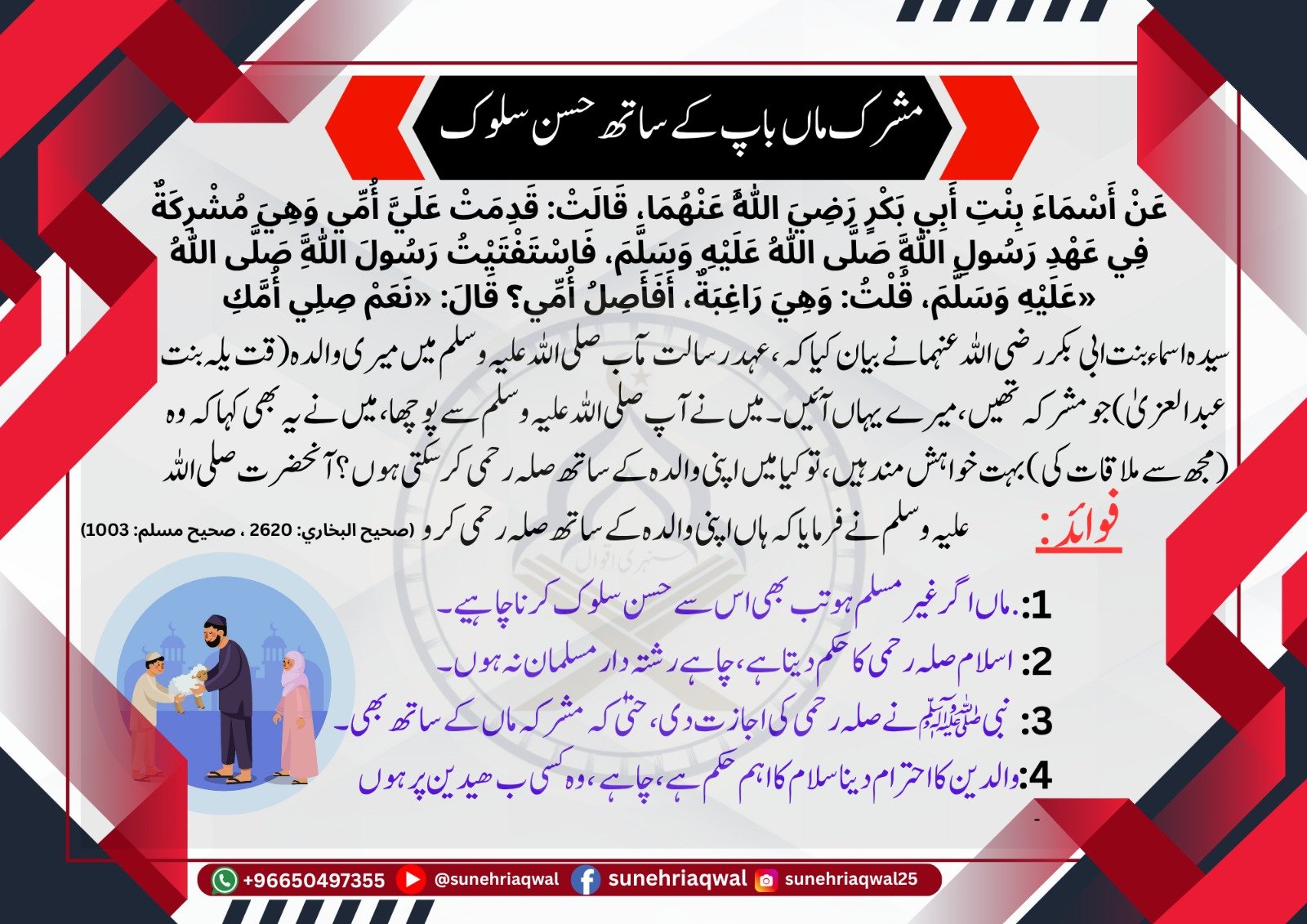 مشرک ماں باپ کے ساتھ حسن سلوک ( صحیح البخاری – 2620 صحیح مسلم – 1003 )