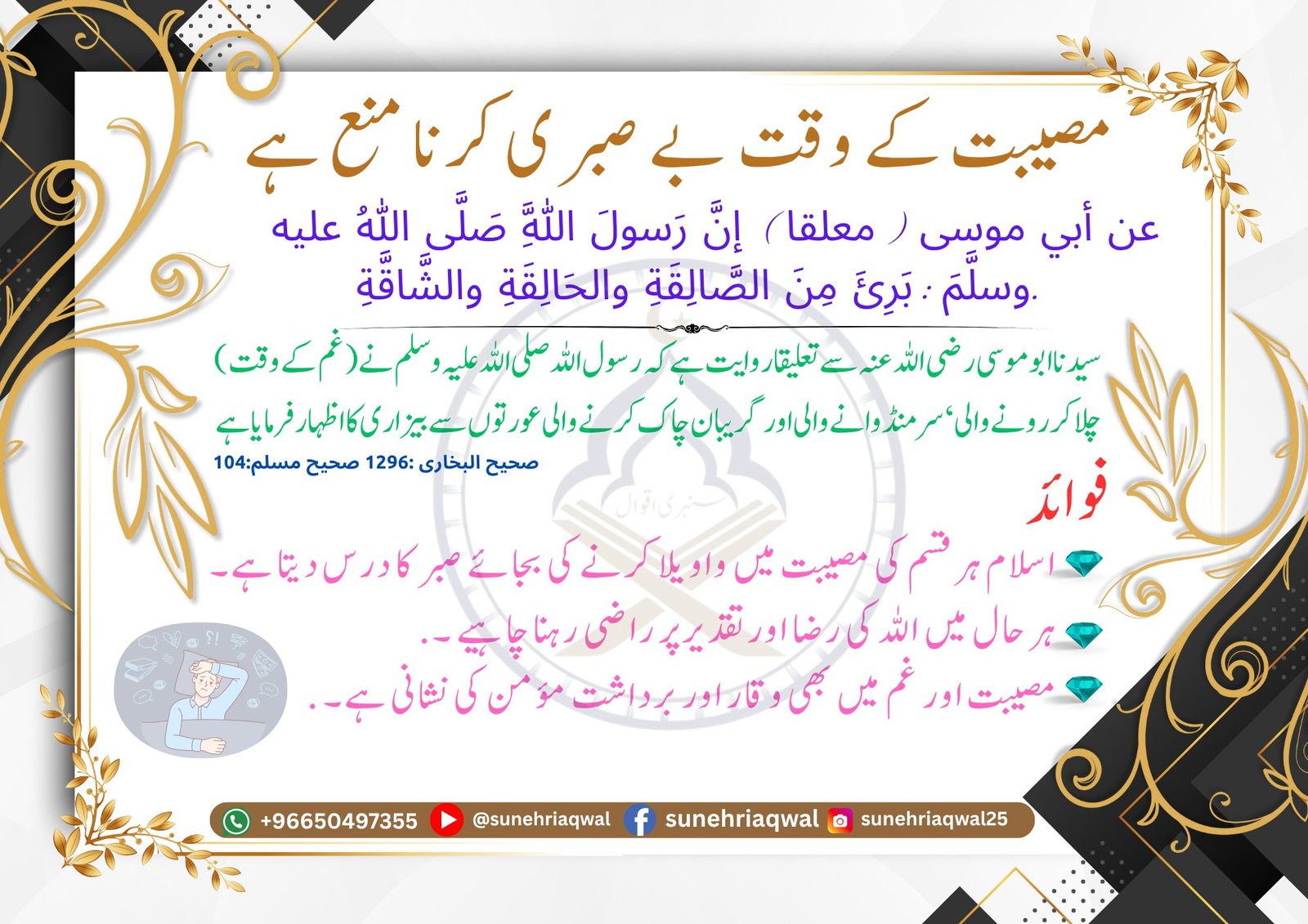 مصیبت کے وقت بے صبری کرنا منع ہے ( صحیح البخاری -1296 صحیح مسلم -104 )