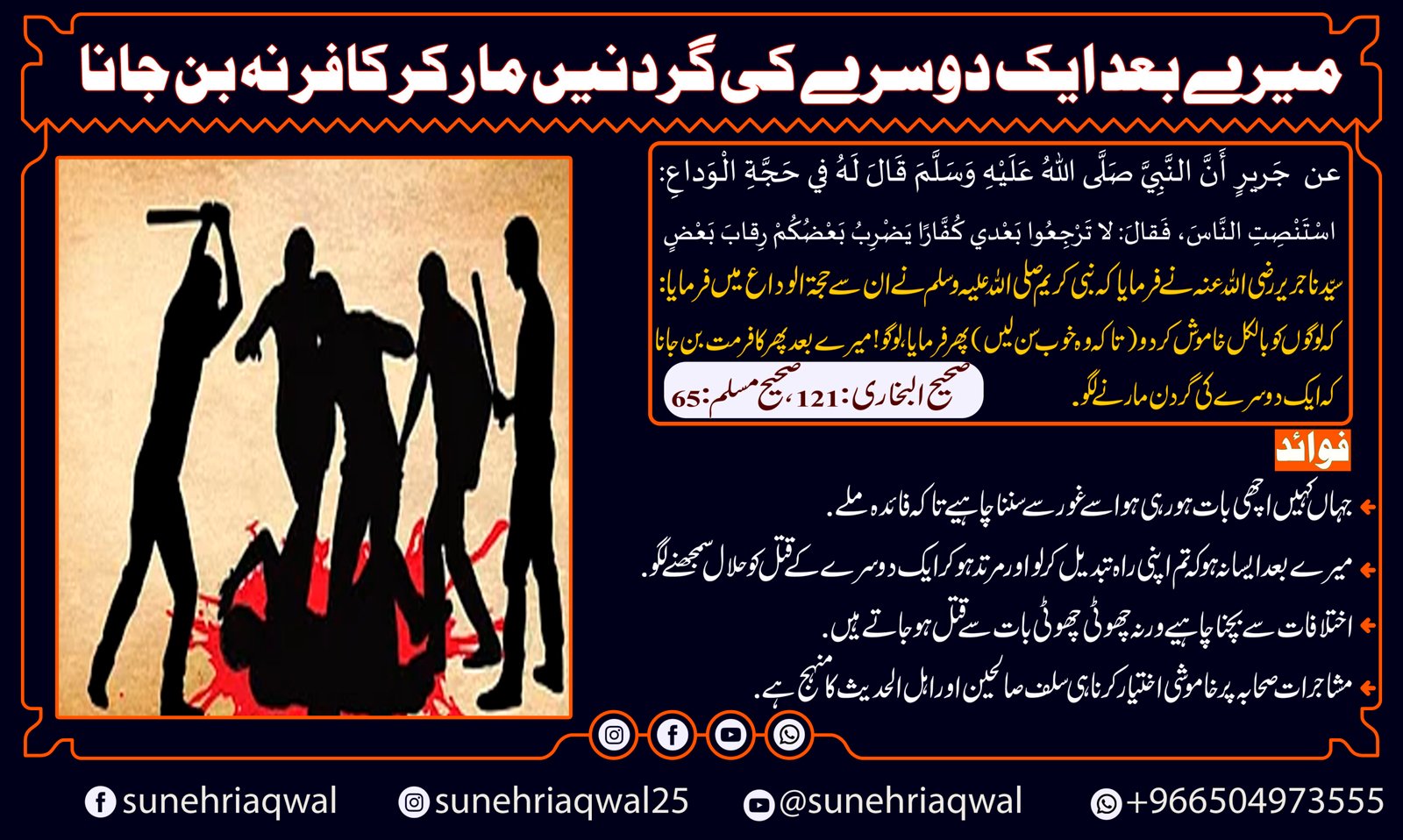 میرے بعد ایک دوسرے کی گردنیں مار کر کافر نہ بن جانا (صحیح بخاری121)