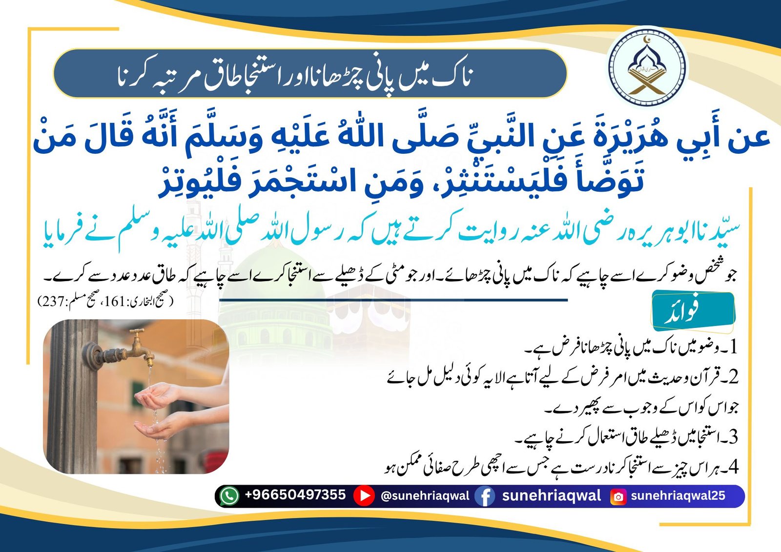 ناک میں پانی چڑھانا اور استنجا طاق مرتبہ کرنا ( صحیح البخاری  -161 صحیح مسلم -237 )