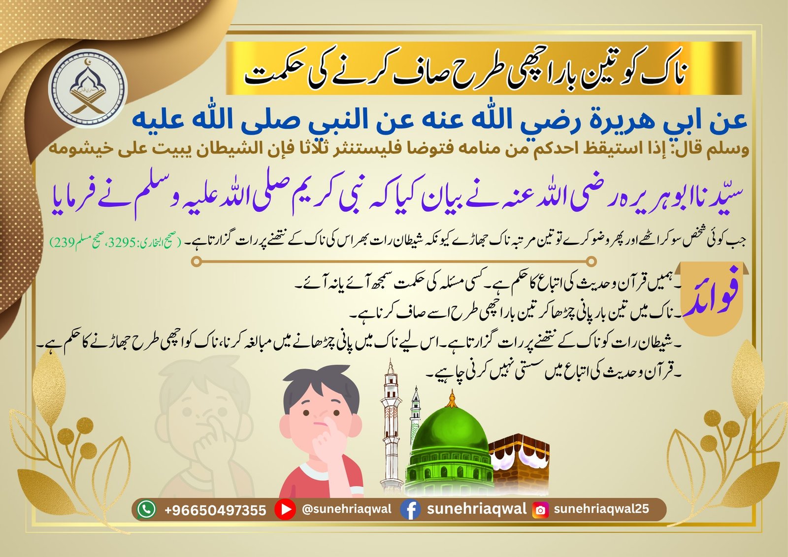ناک کو تین بار اچھی طرح صاف کرنے کی حکمت ( صحیح البخاری  -3295 صحیح مسلم -239 )