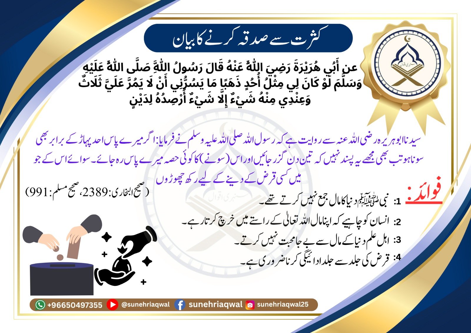 کثرت سے صدقہ کرنے کا بیان ( صحیح البخاری – 2389 صحیح مسلم – 991 )