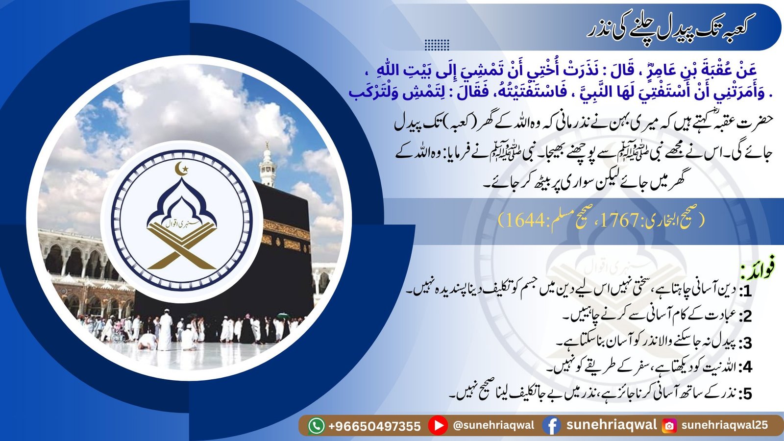 کعبہ تک پیدل چلنے کی نذر ( صحیح البخاری -1767 صحیح مسلم – 1644)