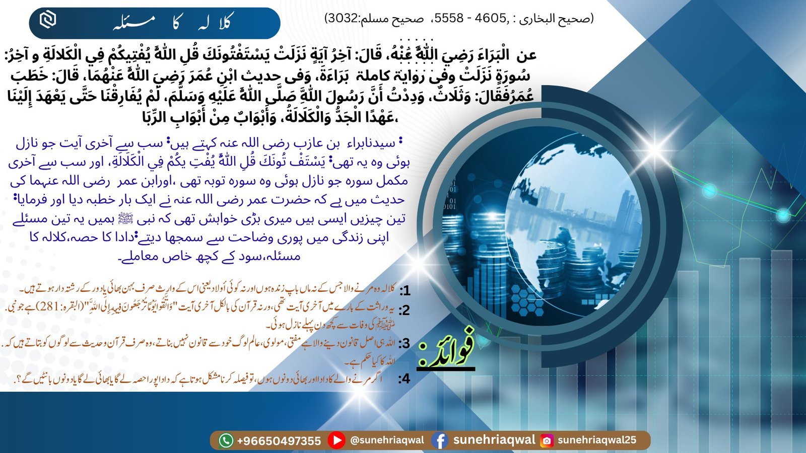 کلالہ کا مسئلہ( صحیح البخاری – 4605-5558 صحیح مسلم – 3032)