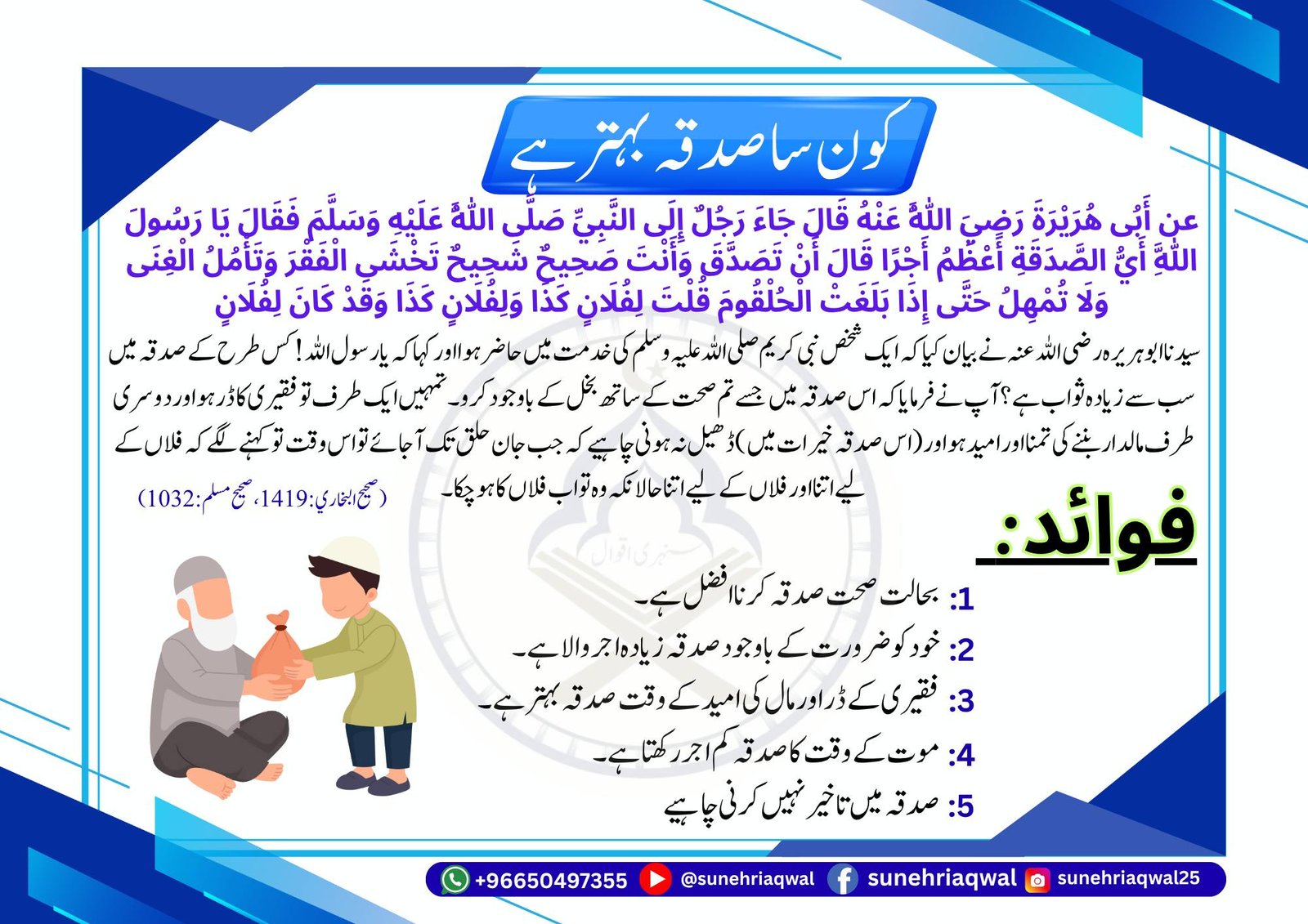 کون سا صدقہ بہتر ہے ( صحیح البخاری – 1419 صحیح مسلم – 1032 )