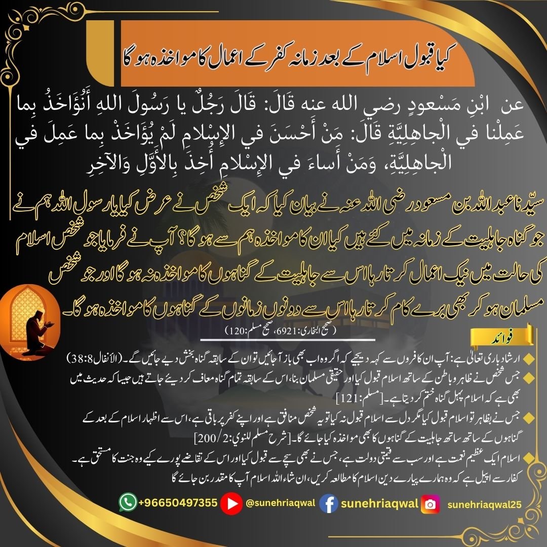 کیا قبول اسلام کے بعد زمانہ کفر کے اعمال کا مواخذہ ہوگا ( صحیح البخاری  -6921 صحیح مسلم -120 )