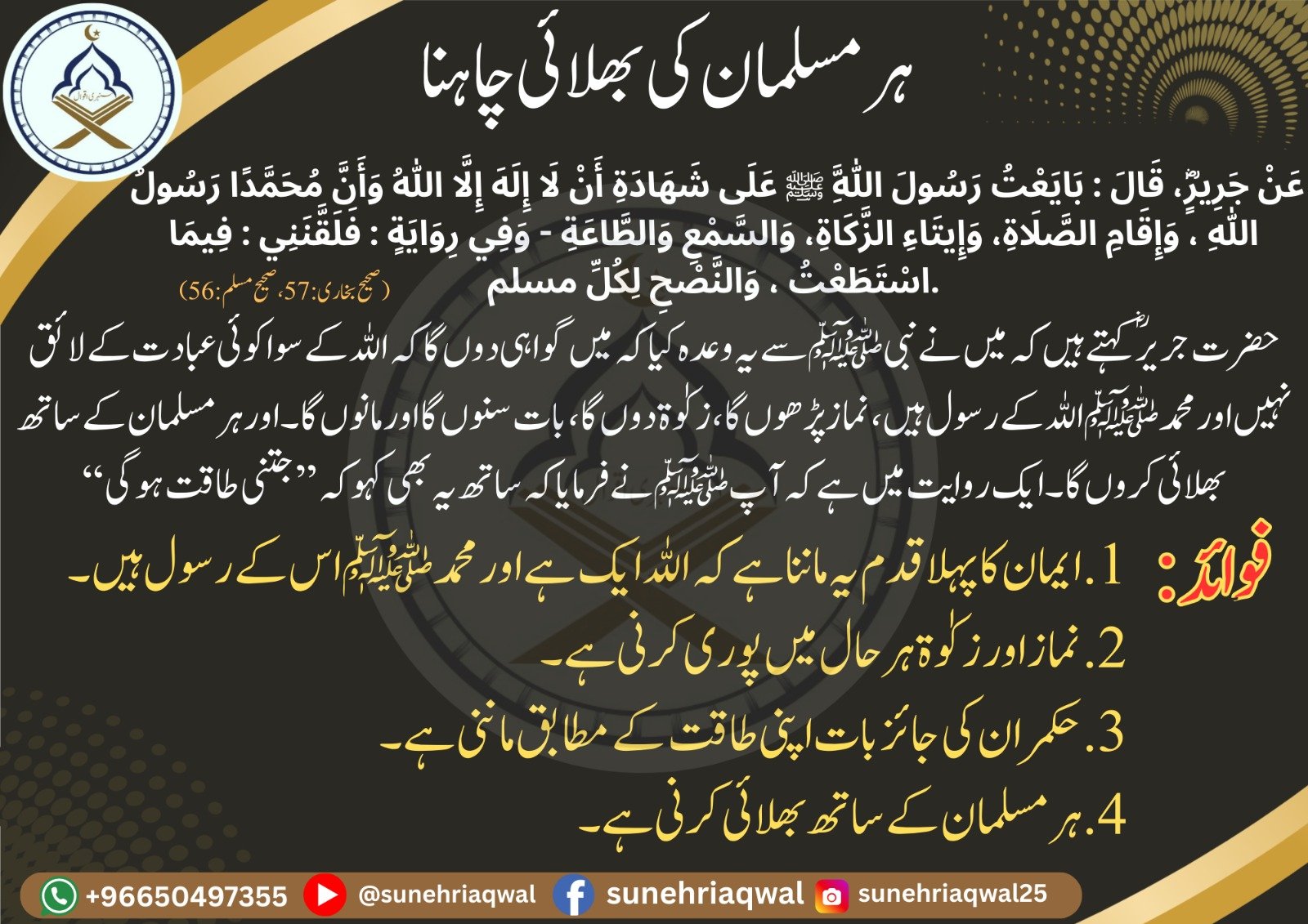 ہر مسلمان کی بھلائی چاہنا ( صحیح البخاری  – 57 صحیح مسلم – 56 )